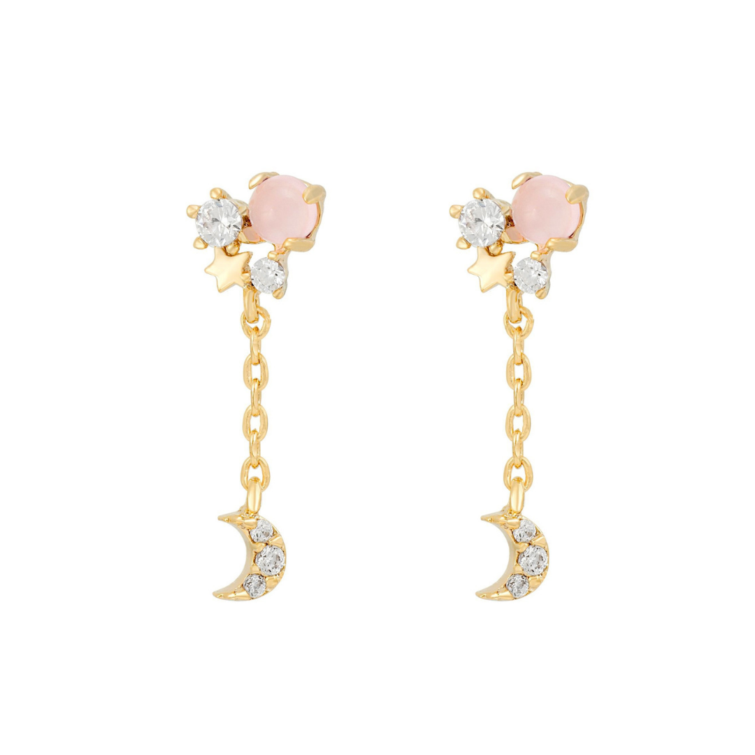 Náušnice Celestia jsou jako noční obloha v mini verzi – růženín v něžné růžové symbolizuje lásku a jemnost, zatímco hvězdy a měsíce se třpytem zirkonů připomínají, že i ty můžeš zářit v temnotě. Jemné řetízky dodávají pohyb a hravost, takže s každým krokem rozzáříš okolí jako kometa. Perfektní „ear party“ kousek, který z tvého looku udělá malý vesmír.