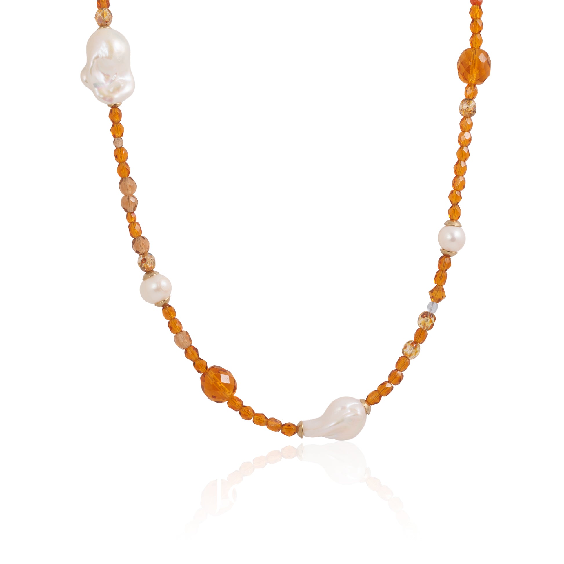 Golden Hour Pearl je ručně vyrobený náhrdelník, který spojuje pravé říční perly s českými broušenými korálky, a vytváří tak jemné světelné odlesky, které rozzáří tvou pleť i den.