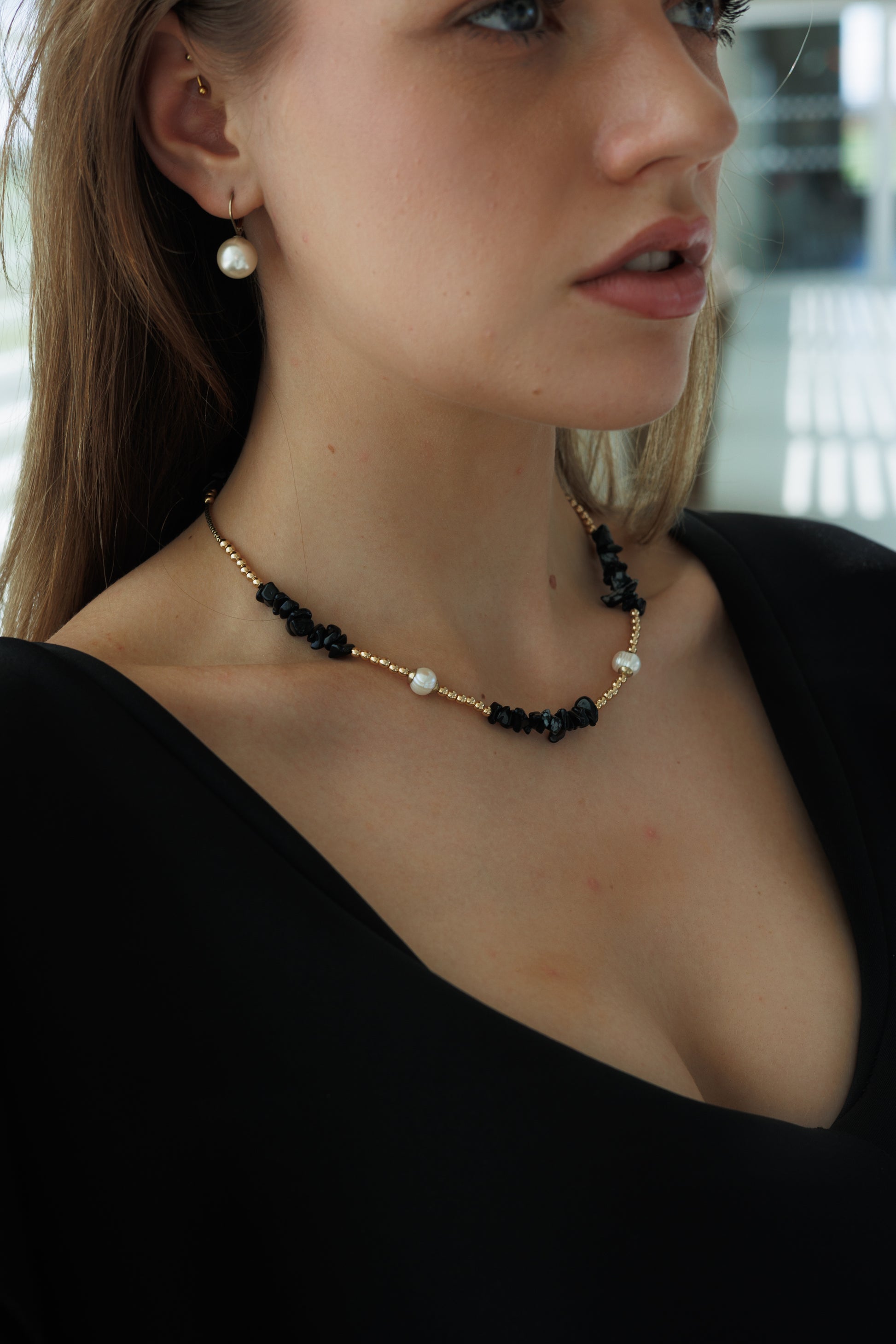 Náhrdelník Midnight Harmony spojuje temný lesk obsidiánu, zlatý hematit a přirozený třpyt pravých říčních perel – tři elementy, které spolu tančí v dokonalé harmonii.
