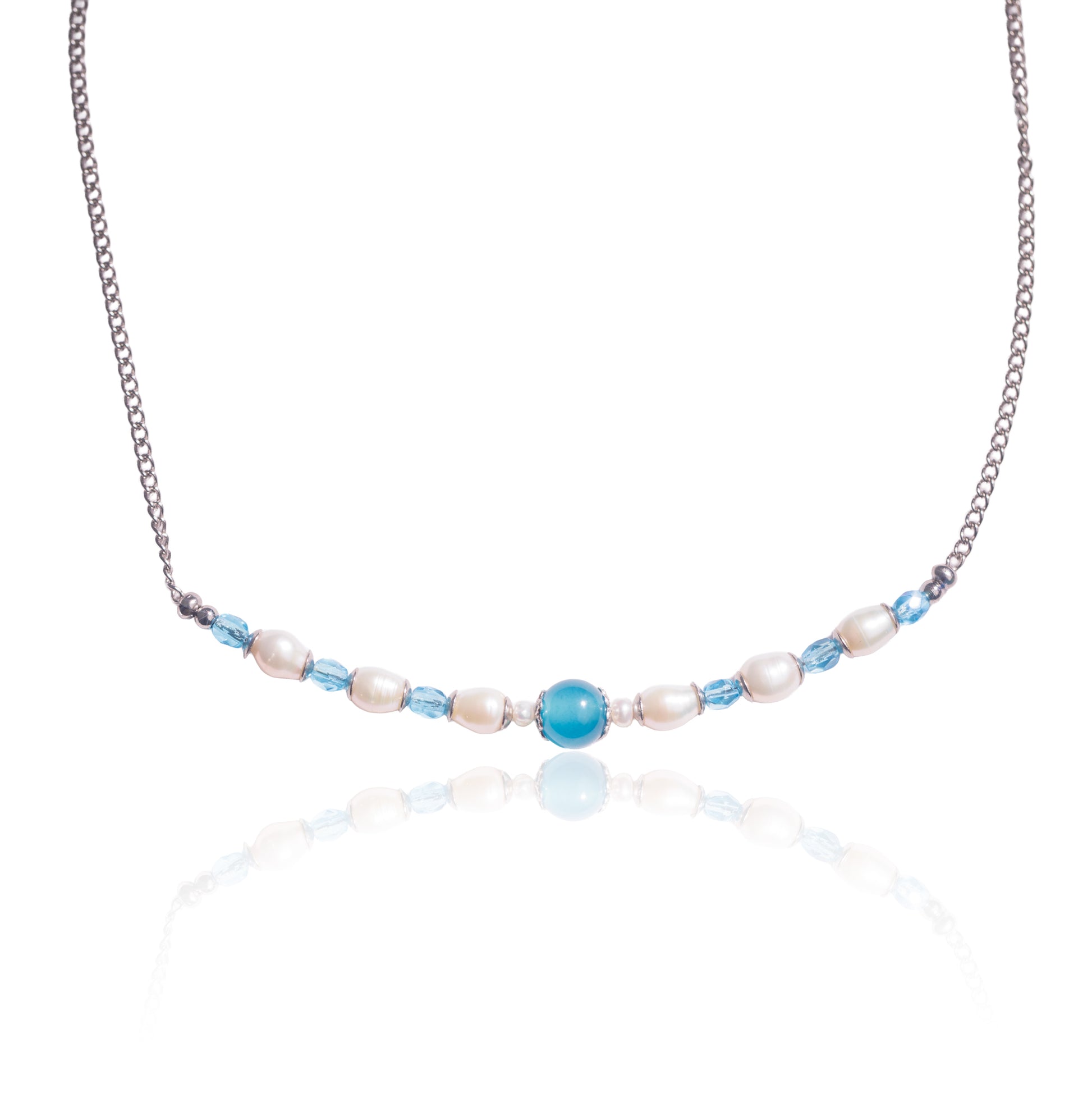 Jemnost perel, hloubka oceánu. Sea Whisper je jako šepot mořských vln – klidný, čistý a plný světla. Kombinace bílých říčních perel a modrého achátu v sobě spojuje ženskou něhu a sílu přírody. Každý kus je ručně vyrobený v Česku, aby nesl osobní dotek a harmonii.