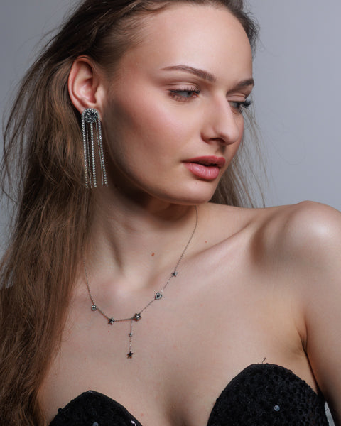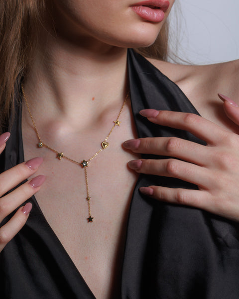 Náhrdelník Starlit Dreams působí jako drobná soukromá galaxie na tvém krku. Hvězdičky s jemnými zirkony a malé srdíčko vytvářejí harmonii, která je hravá, něžná a lehce magická. Středový „Y“ efekt dodává šperku elegantní vertikální linii, která krásně podtrhne dekolt a přidá outfitu ten nenápadný wow moment.