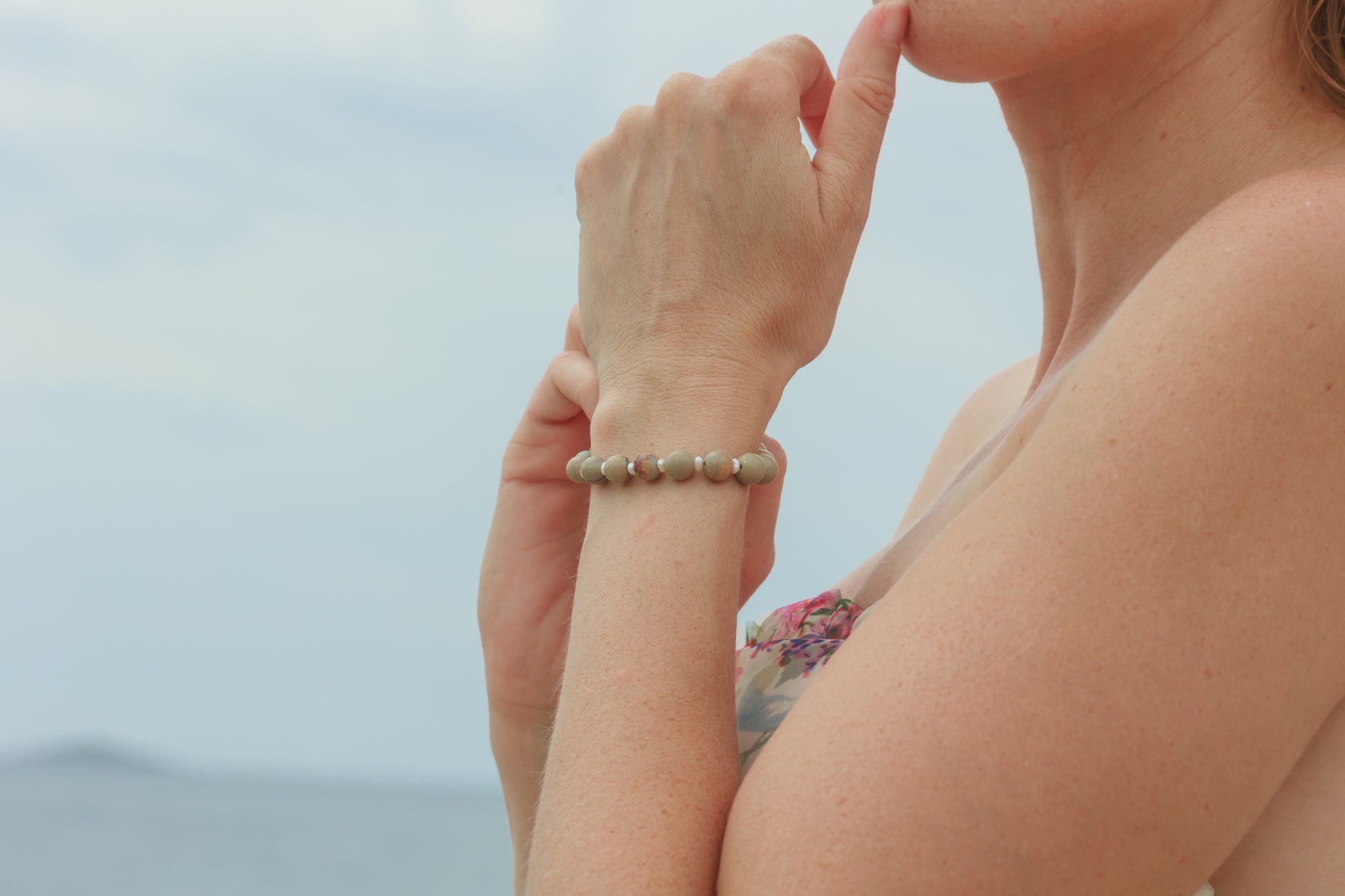 Každý kámen nese svůj příběh. Tento náramek jsem vytvořila sama s láskou k detailu – kombinuje zemité tóny jaspisu s jemností pravých říčních perel. Jaspis přináší klid a stabilitu, perly vnášejí něhu a harmonii. Společně tvoří šperk, který tě propojí s přírodou a dodá tvému outfitu elegantní nádech.