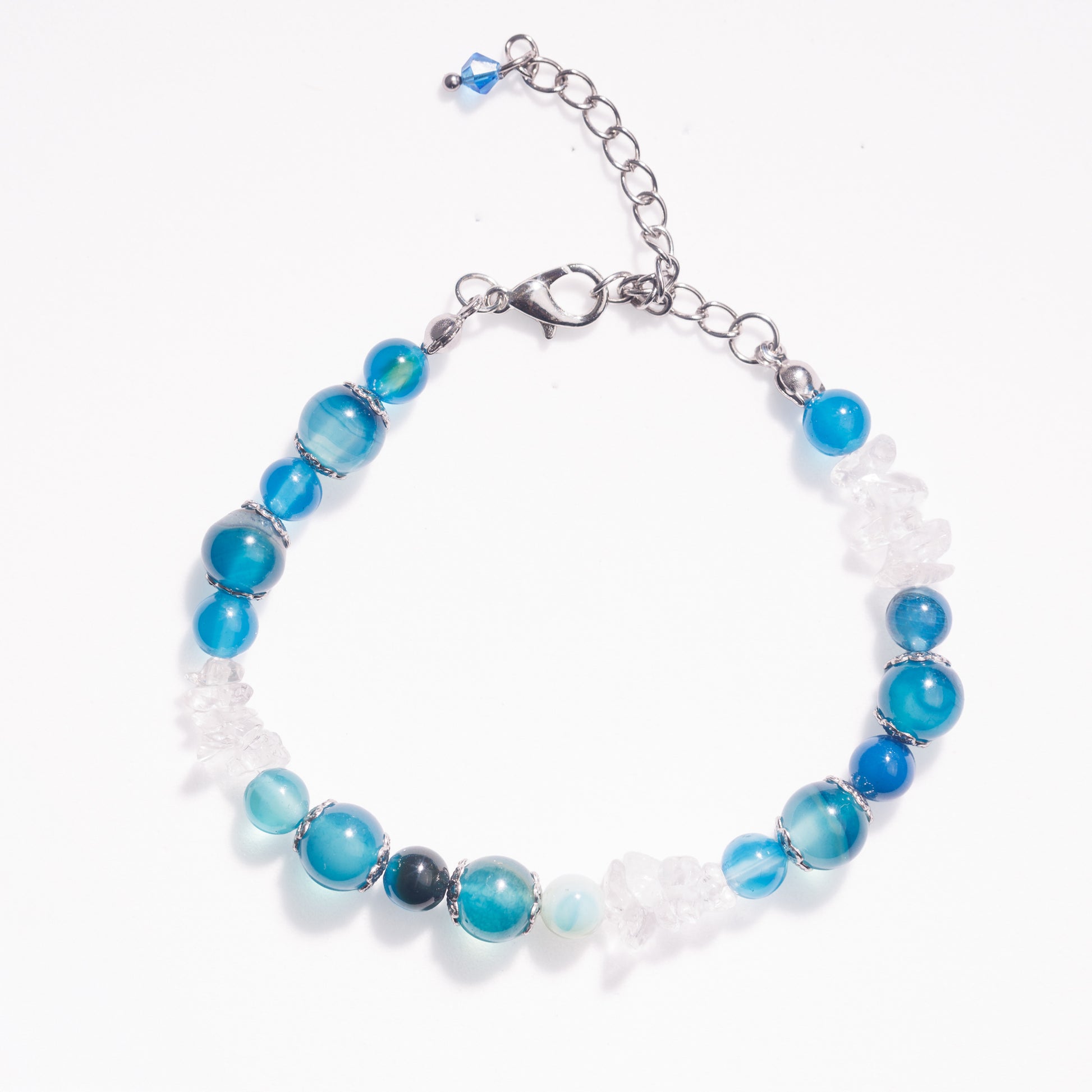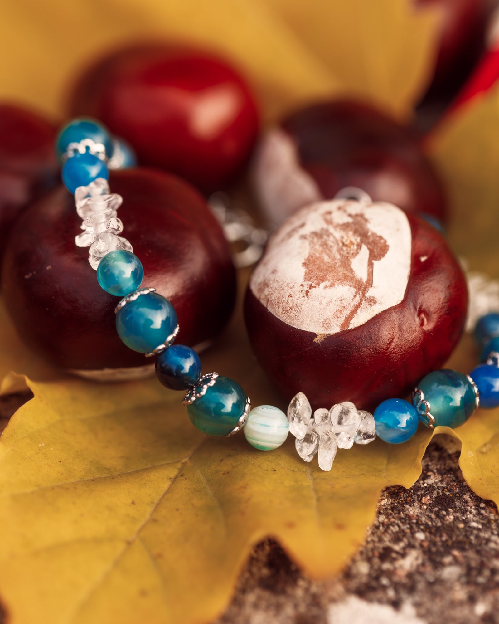 Jako když se dotkneš moře. Ocean Spirit v sobě spojuje hloubku modrého achátu a čistotu křišťálu – dva kameny, které uklidňují mysl, čistí energii a vrací harmonii. Každý náramek je ručně vyrobený v České republice s důrazem na detail a přirozený tok barev, které připomínají světlo na vodní hladině.
