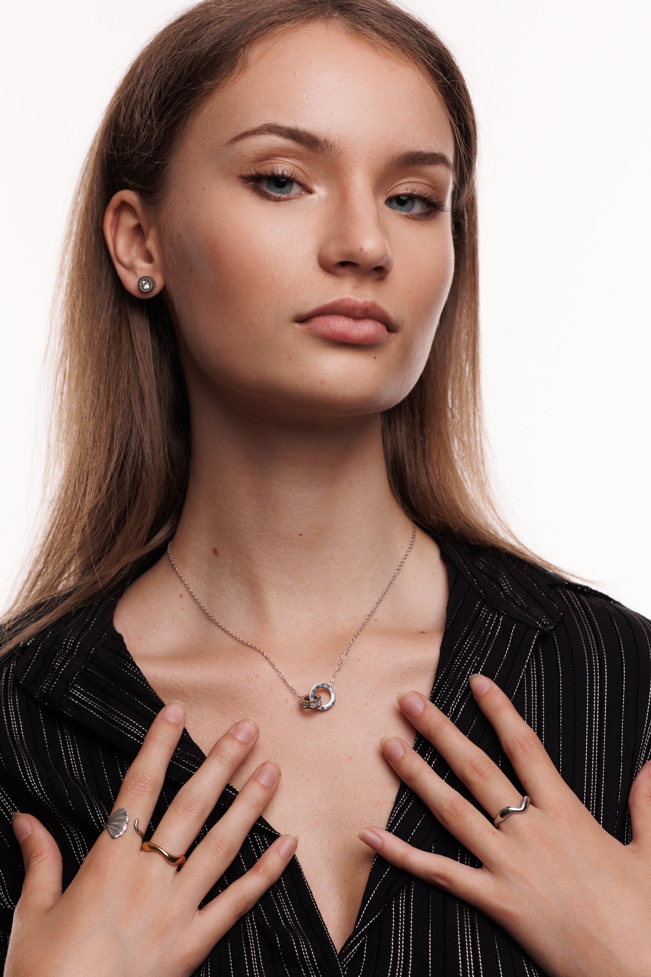 Dva kroužky, dvě vrstvy, dvě energie. Obojí na nadčasovém náhrdelníku, kde se tyhle dva kroužky propojují. Jeden se třpytí, druhý nese římské číslice – čas, který se spojil s krásou.