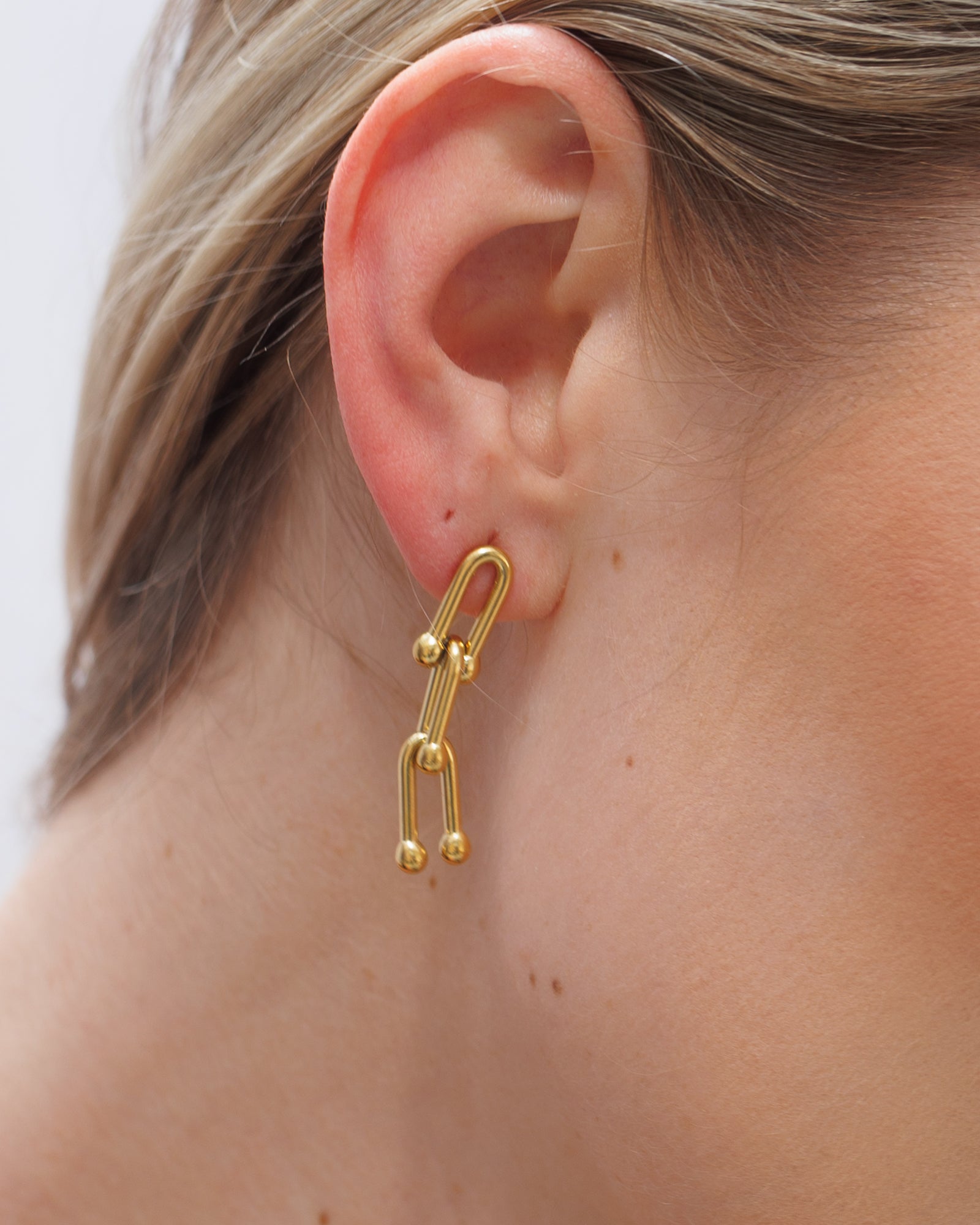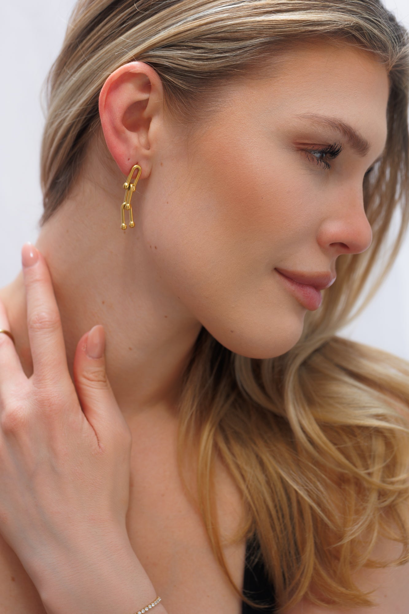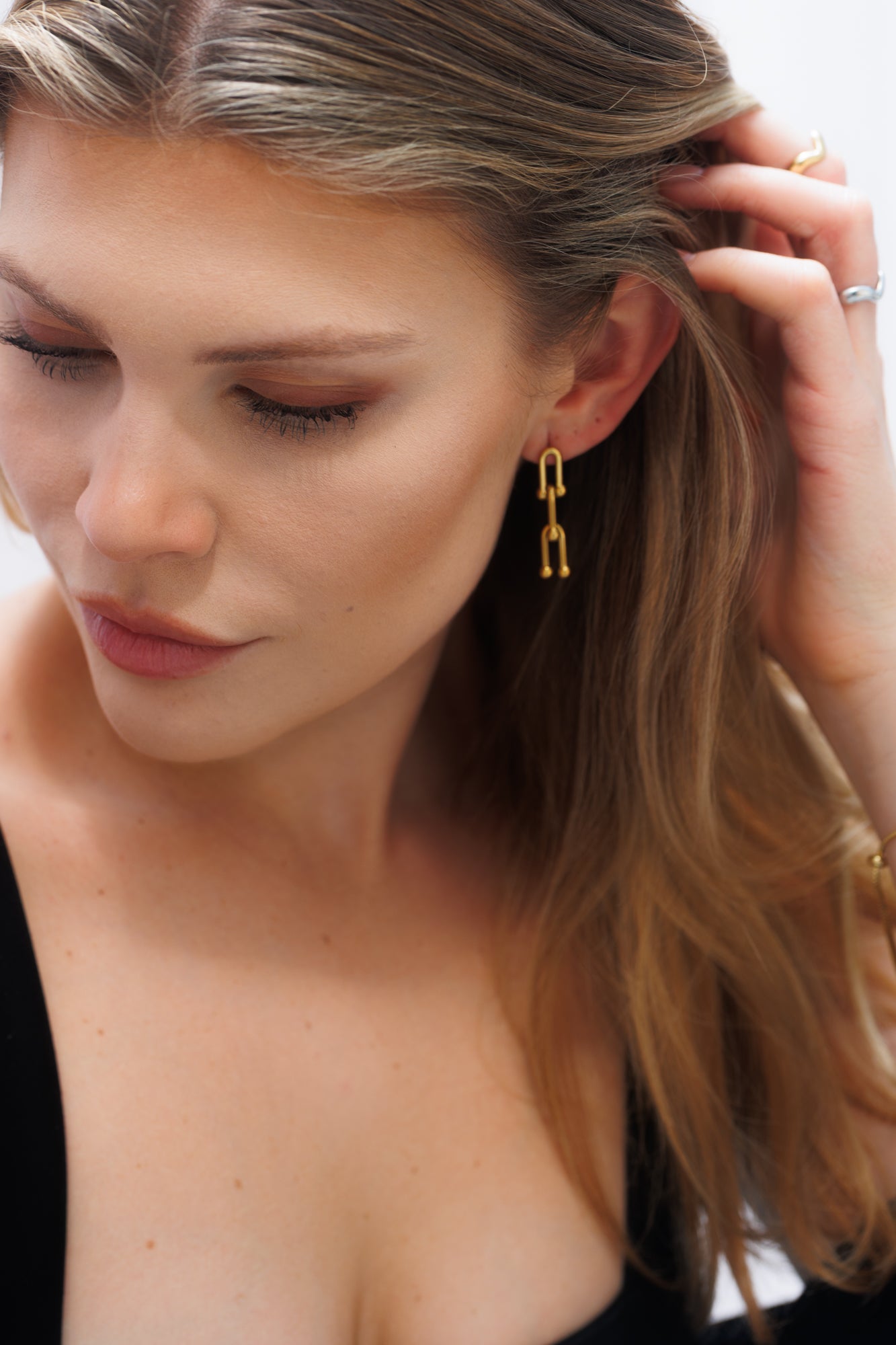 Tři zlaté body spojené tenkými liniemi připomínají orbitu, hudební notaci nebo sochu – z každého úhlu jiné. Jsou moderní, hravé a krásně zvýrazní tvůj profil.