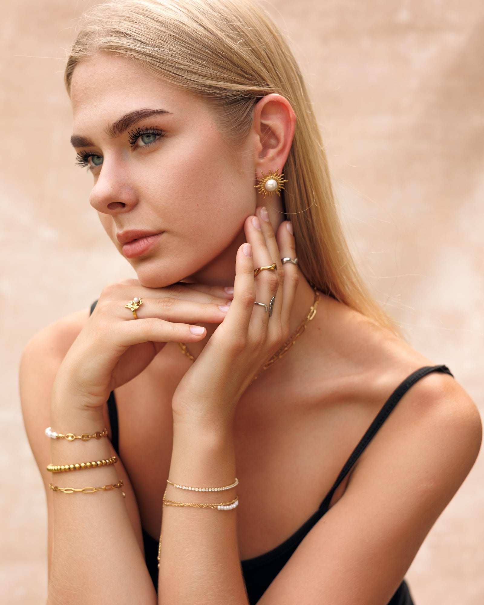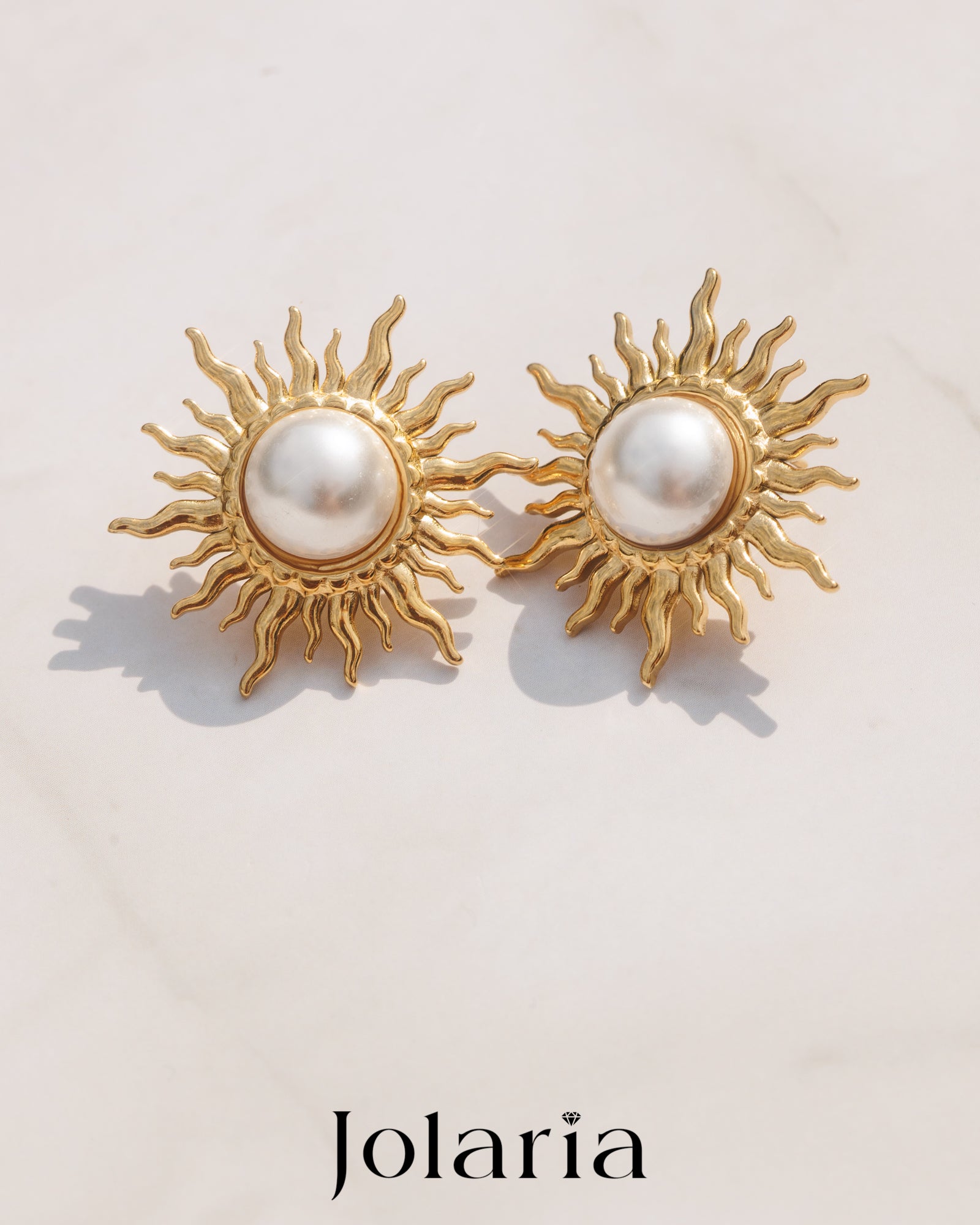 Slunce v uších, glow v duši. Výrazné náušnice s perlovým středem a paprskovým designem přinášejí pocit bohyně – ať už míříš na kávu, nebo na své malé soukromé pódium.