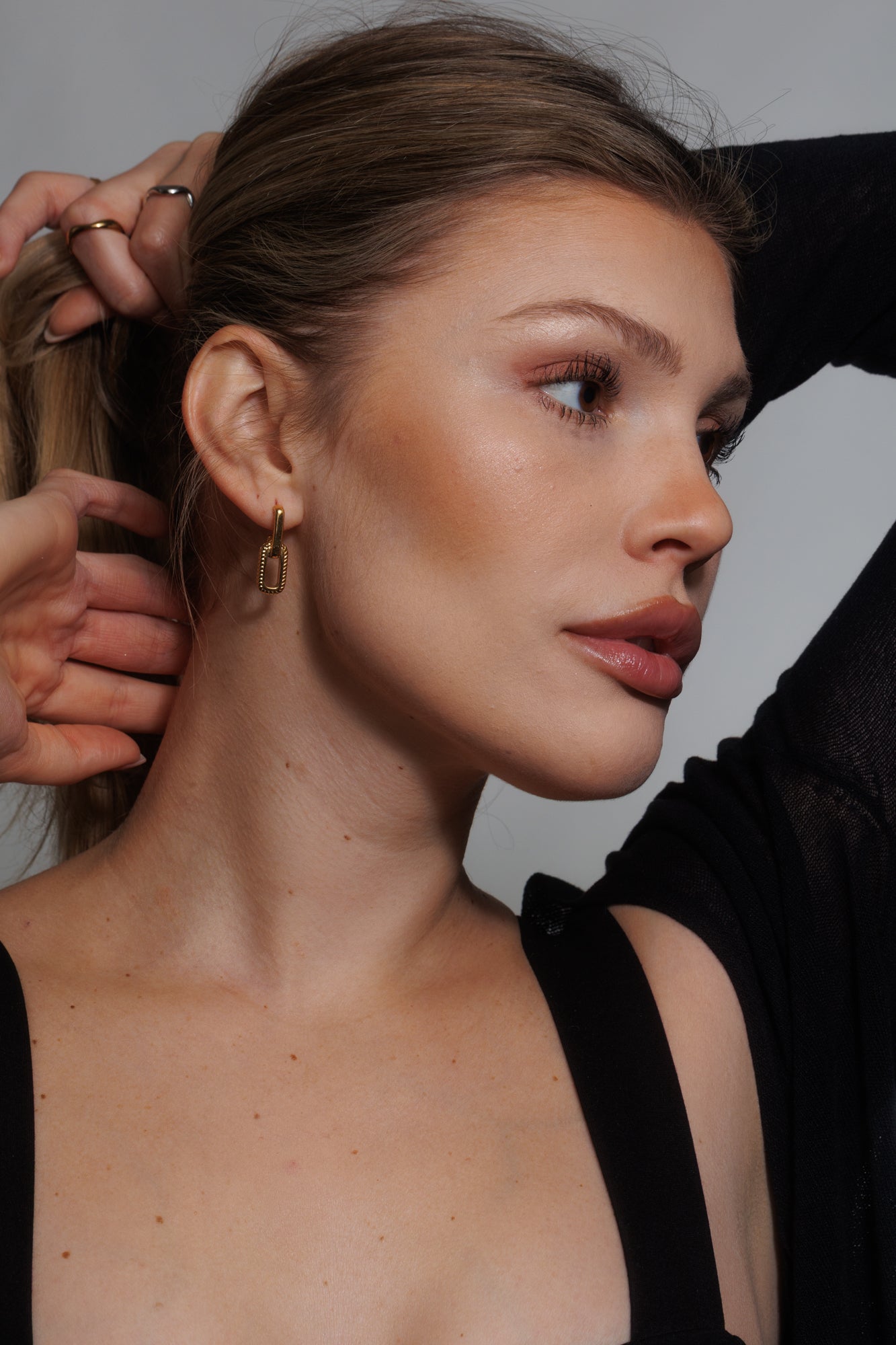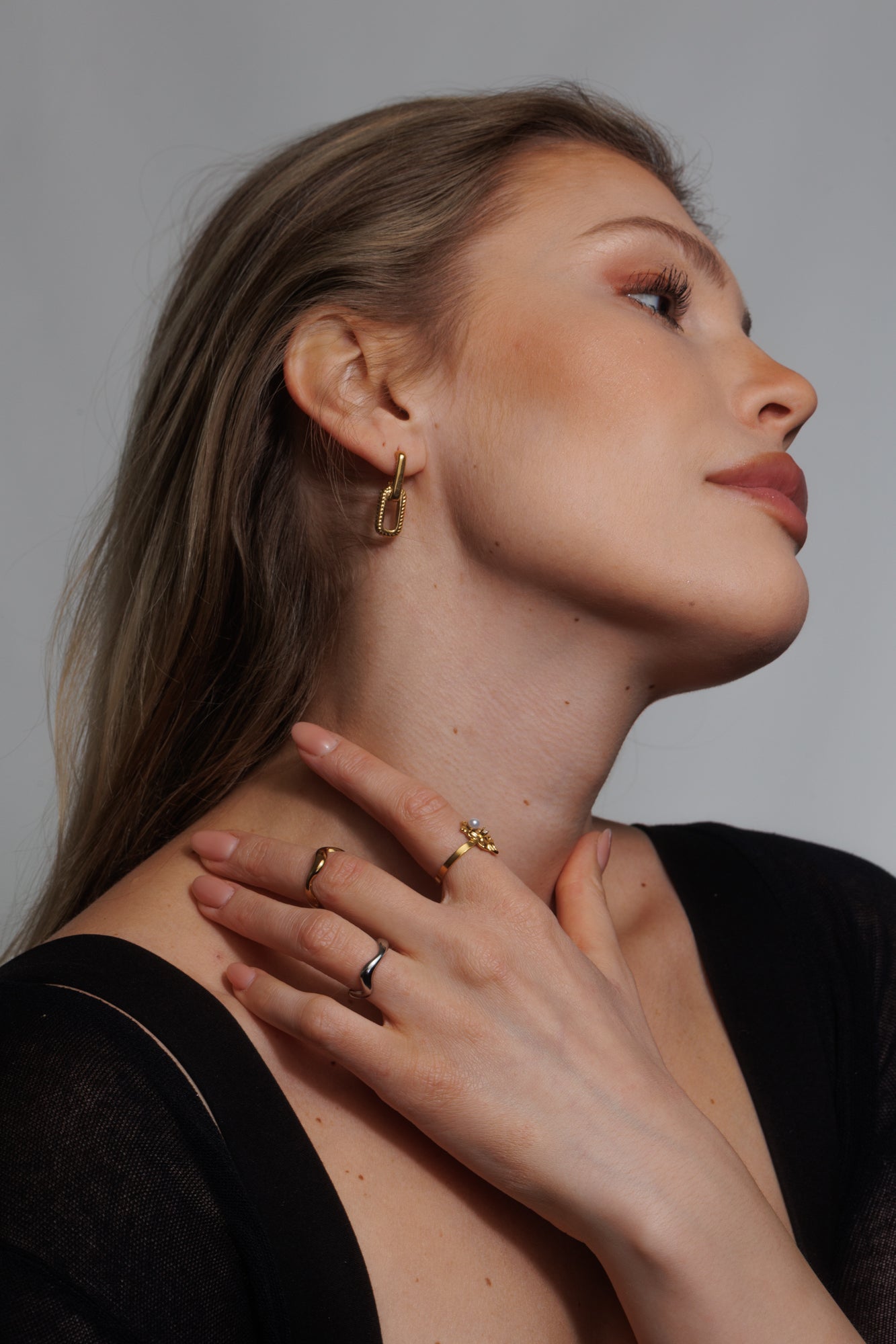Geometrie a detail jdou v téhle dvojici ruku v ruce. Vypadají skvěle k džínám i k šatům – prostě zlaté spojení stylu a sebevědomí.