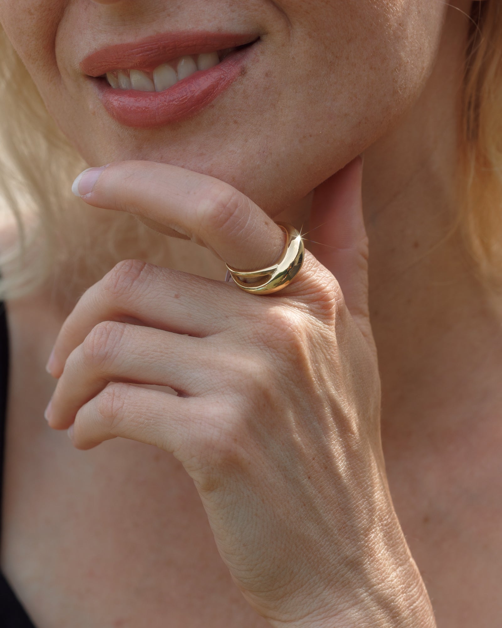 Prsten Odvážná je šperk, který si vezme pozornost pro sebe. Robustní tvar a hladký lesk z něj dělají statement kousek, který pozvedne každý outfit – ať už jdeš do práce, nebo na večírek. Nosit ho můžeš samostatně jako dominantu nebo kombinovat s jemnějšími prsteny pro kontrastní look.