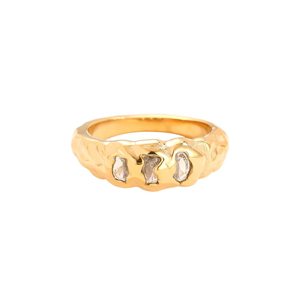 Jako kdyby ses právě dotkla lávového zlata. Hrubý povrch, jemný lesk a tři záblesky, které připomenou, že i v chaosu se dá najít harmonie. Prsten Raw Glint je odvážný, výrazný a navržený pro ty, které se nebojí trochu zazářit.