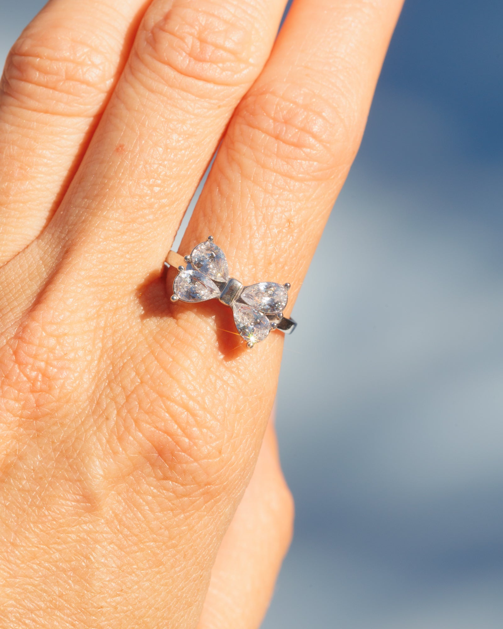 Prsten s mašlí Radostná je ztělesněním ženskosti a jemné elegance. Třpytivá mašle osazená čirými kameny symbolizuje radost, lehkost a hravost – jako když si oblékáš svůj oblíbený outfit, který tě okamžitě rozjasní. Díky nastavitelné velikosti padne dokonale na každý prst a stane se tvým univerzálním doplňkem, který nikdy nevyjde z módy.